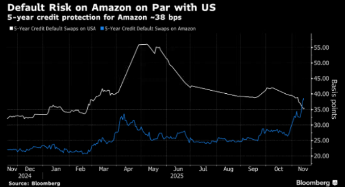 In contrast, default protection for five years on the US trades at just 35 bps. It has $38 trillion in debt outstanding, nearly 250 times what Amazon has.