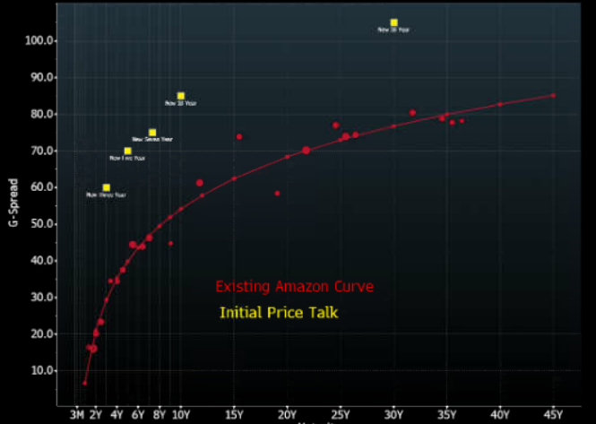 Here’s what the initial price guidance on the new $12 billion bonds looks like compared with Amazon’s existing curve. It looks very wide. That’s why there’s a book of $80 billion which is on sale now. The guidance is likely to get tightened.