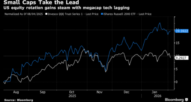Small caps are taking the baton from big tech as a renewed selloff in software and AI-linked names drags on the Nasdaq 100 and stalls the broader market advance.