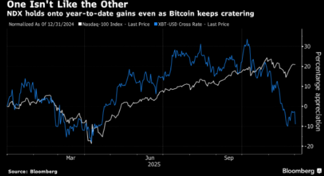 The two asset classes retain a strong technical link, with Bitcoin’s correlation to equity indexes still pretty tight. Yet that has begun to loosen as it’s becoming clearer that the renewed crypto slump isn’t signalling a broader risk-off turn rather, it’s just an extension of a crypto-specific unwind.
