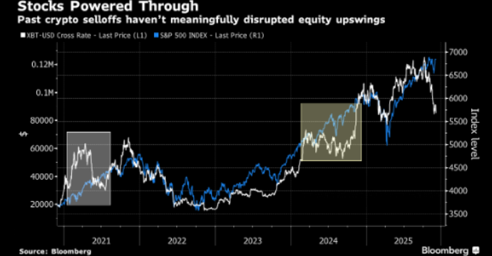 Past pullbacks in crypto have also failed to dent stocks too much. In the past five years, except during major risk events that took all risk assets down (like the 2022 Fed tightening or this year’s tariff shock), stocks have often pushed higher despite steep selloffs in crypto.
