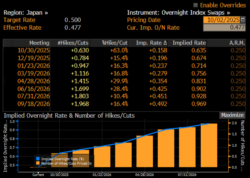 Summary: Recent Japanese economic indicators have showed that local economy is performing well in spite of US tariff effects on Japanese exports but inflation is running consistently ahead of it’s 2% target. Hence the much delayed 25 bps rate hike from BOJ can be expected in it’s 30th Oct meeting. Recent political issues have delayed the rate hike but assuming Takaichi does not win, we see strong probability of 25 bps rate hike by the BOJ in the October meeting.