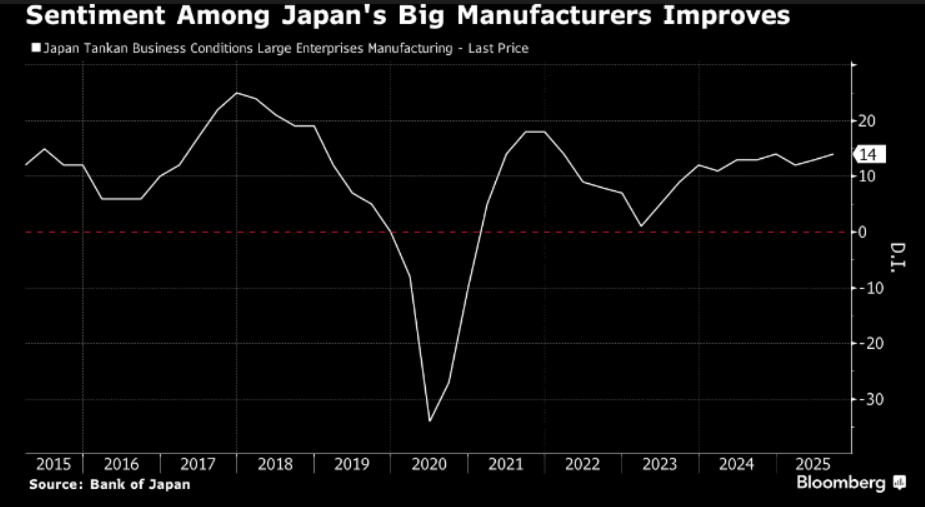 The business sentiment index climbed to 14 from 13 in the three months ending September according to the BOJ’s latest quarterly Tankan business survey Wednesday. That matched the median economist forecast in a Bloomberg survey.