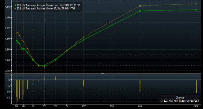 The curve is flatter and the long end about 10 bps richer than it was at the September FOMC, reflective of the ongoing government shutdown and corresponding data vacuum. Even a modest recalibration in expectations could trigger a temporary backup in yields. Still, any such selloff is likely to prove fleeting, with policy and data momentum still biased toward gradual easing into 2026.