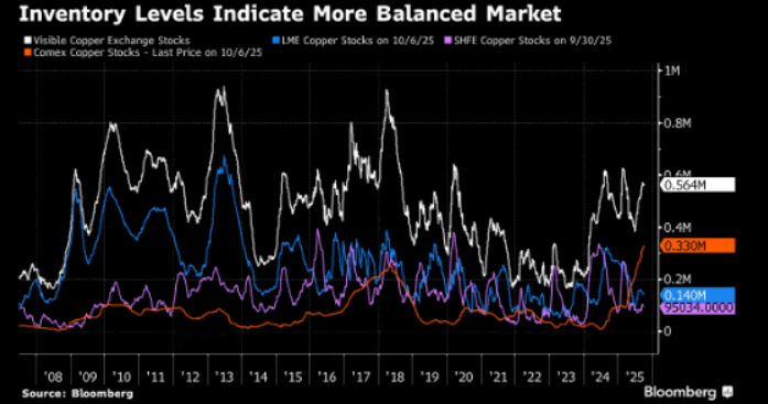 Concentrate treatment and refining charges remain deeply negative, a tell that raw-material supply is tight in the wake of Grasberg’s outage. Visible stocks of refined metal in exchange warehouses have climbed but are still not signalling surplus conditions. The futures curve also agrees as after months of backwardation, the LME structure has flipped into contango, which shows near-term tightness is easing and trade flows are normalizing.
