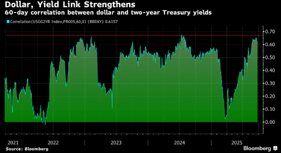 A shutdown itself historically tends to weigh on the greenback, though the impact is usually modest and short-lived. Short-term safe-haven Treasury demand into the shutdown can push yields lower, undermining the dollar at the margin. After a brief decoupling earlier in the year amid the “sell America” rush out of US assets, the greenback’s correlation to rates has snapped back, near 2024 highs on a 60-day basis.