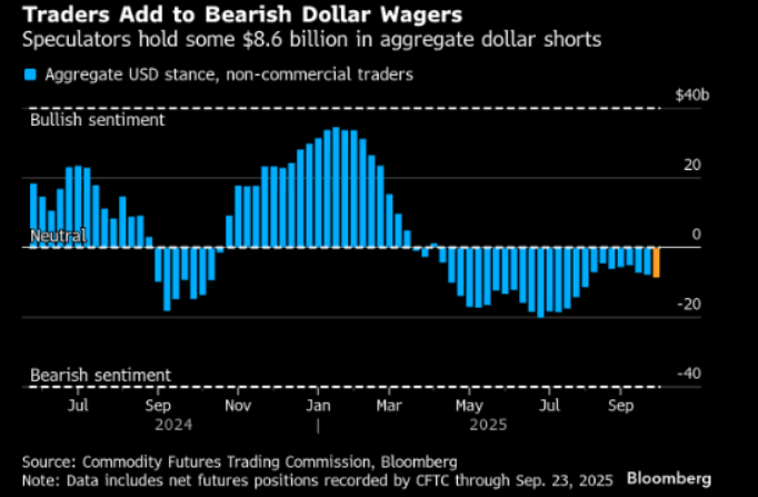 Speculative traders added to their already-short positioning on the US currency in the week through Sept. 23. Non-commercial traders -- a group that includes hedge funds, asset managers and others -- raised their bets against the greenback to some $8.6 billion, according to the latest Commodity Futures Trading Commission data released Friday. This group is now the most negative on the US currency since late July.