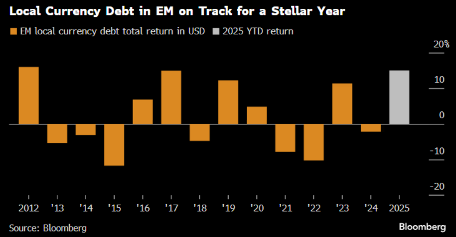 The combination has driven emerging-market government debt to outperform most fixed income investments globally. The 15% jump is more than twice that of US corporate junk bonds, and compares with 5.4% gains in the Bloomberg US Treasury Index. The rally has been led by Brazil, Mexico, Colombia, Hungary and South Africa — all of which gained at least 23% this year.