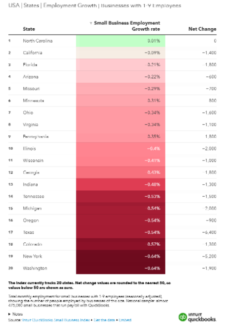 Employment at small businesses declined by 48,400 jobs in September, according to data compiled by software provider Intuit, owner of Quickbooks. Using anonymized data from 533,000 small businesses to track employment, Intuit found employment decreased in 19 of 20 states, across all eight US regions and in all 12 sectors tracked.