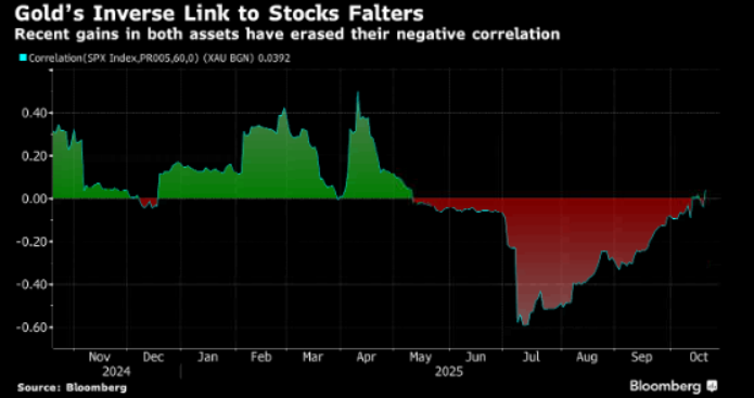 Despite its hedging allure, gold’s negative correlation with stocks has pretty much vanished on a short-term, 60-day basis.