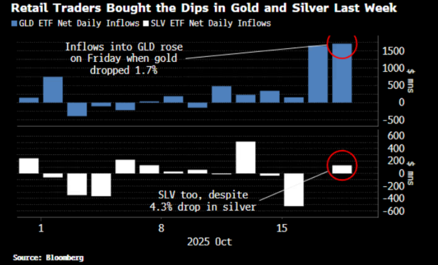Retail traders are not ready to write off gold after Friday’s 1.7% selloff, which extended to 3.4% intraday, with the largest gold ETF, the GLD, showing large net inflows on the day.