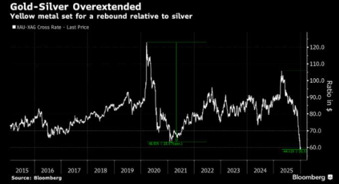 Silver’s run looks overextended against gold. Especially as the shift in the gold-silver ratio is nearing the extremes seen back in 2021.
