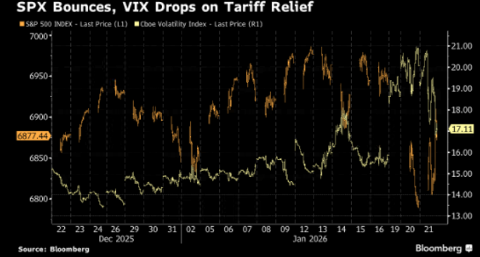 The sharp move higher in US assets tonight after President Donald Trump cited a “framework of a future deal” on Greenland signals the sharp market reversals that were a hallmark of the first year of Trump’s second term are alive and well -- even as investors had started to doubt it. A fast change of stance after just a small pullback in risk assets this week will reinforce belief in these types of trades, based on the market perception that Trump tends to back down from previous positions, will keep policy-related equity selloffs even shallower as a result.