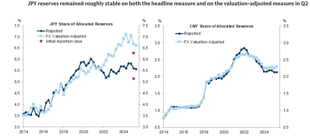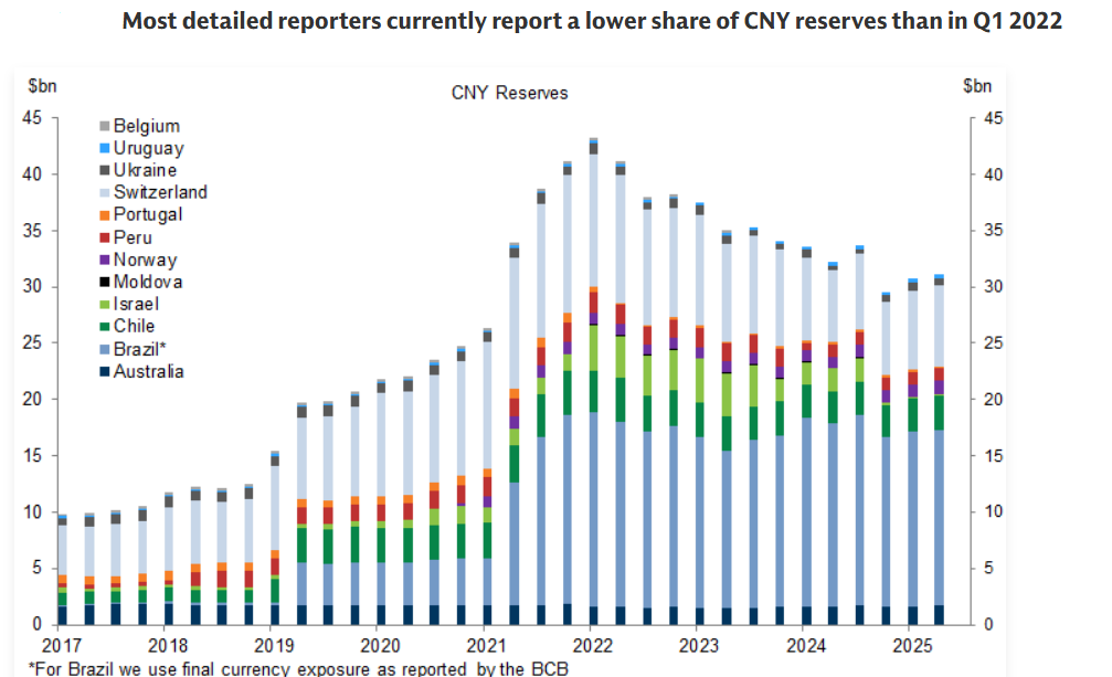 Both the headline and valuation-adjusted share of CNY reserves remained stable in Q2. CNY reserves have remained nearly flat since Q1 2024. Allocated CNY reserves have decreased by around $75bn since the start of 2022. Of the countries that regularly report a geographic breakdown of their reserve holdings, most currently report a lower share of CNY reserves than in Q1 2022.