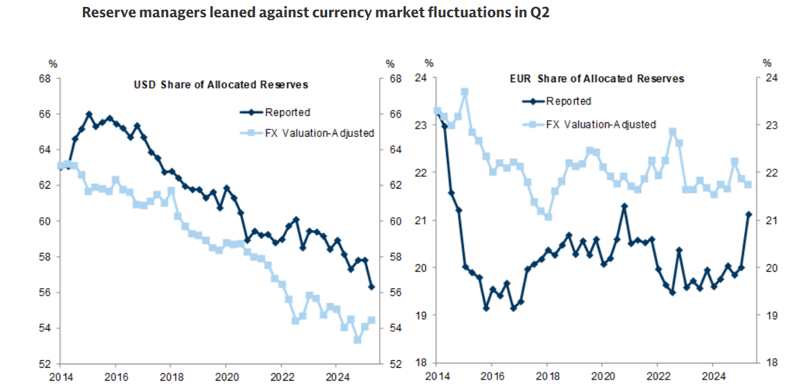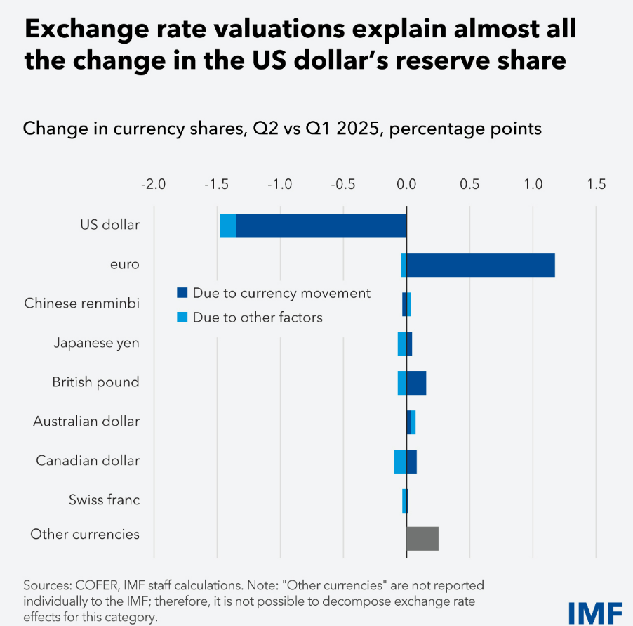 This means that even if central banks made no changes to their portfolios, the value of their non-dollar holdings—when expressed in dollars—increased, resulting in a corresponding decrease in the share of dollar holdings.
