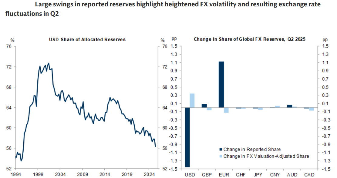 Currency movements explain 92 percent of the reduction of the dollar’s share during the three months through June.