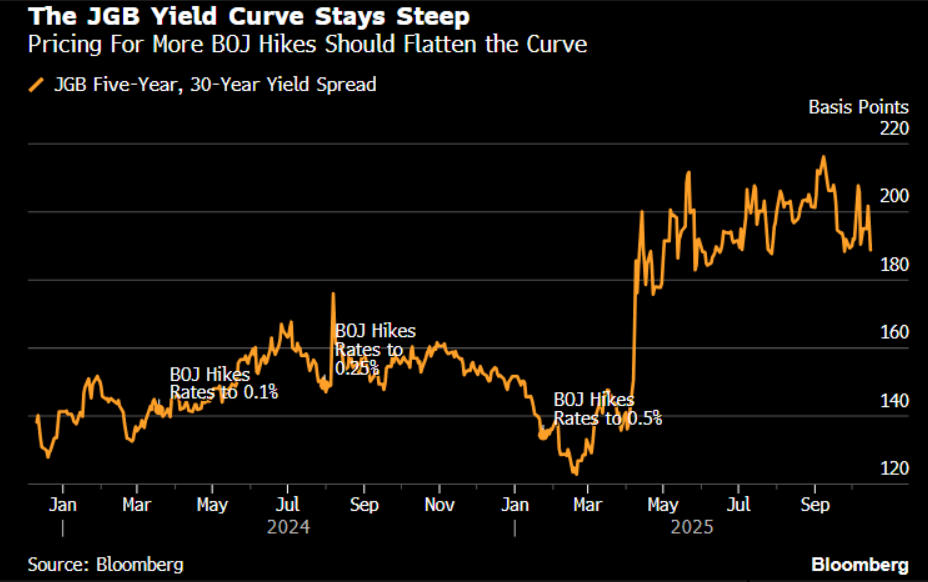 The spread between five-year and 30-year JGBs currently stands around 190 basis points, after swelling to around 216 basis points last month, its widest in data going back two decades. Spreads are significantly higher than around 140 basis points seen in the run-up to the BOJ’s previous hike in January, leaving room to narrow ahead of the next tightening.