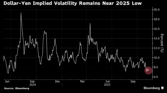 The two-week implied volatility for USD/JPY stood at 7.3% on Tuesday, near the 2025 low of 7.06% recorded earlier this month. Since the formation of PM Sanae Takaichi’s administration in late October which advocates continued fiscal stimulus and monetary easing, the yen’s range shifted lower to 150 to 155-level. The downward trend from the summer range of 145-150 yen appears unlikely to reverse.