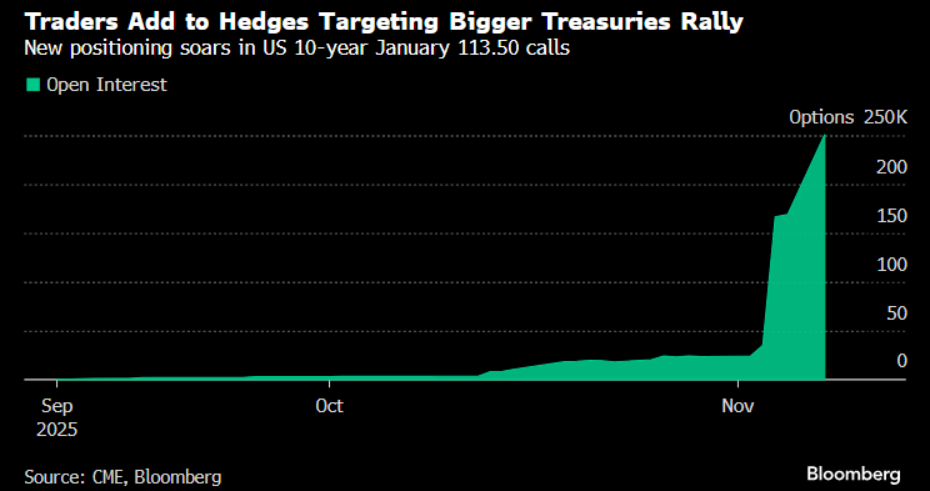 Open interest, or the amount of new positions held by traders, has rapidly risen in bullish options over the past week, targeting a bigger Treasuries rally. The trades have been focused in both the December and January options, which expire Nov. 21 and Dec. 26.