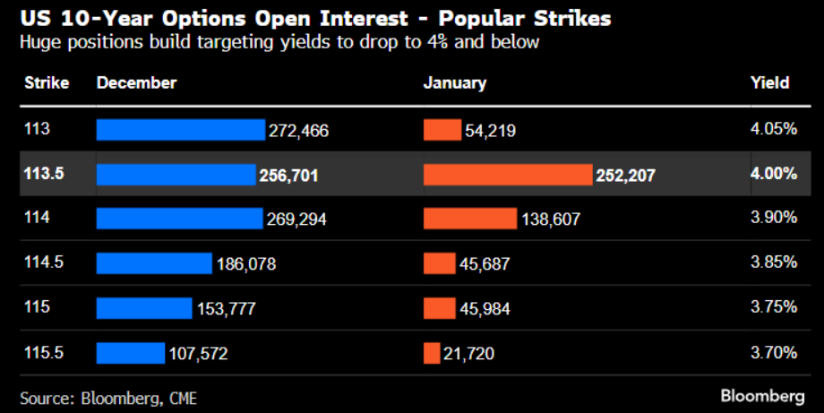 Most of the buying has occurred in strikes which equate to a 4% yield on 10-year Treasuries, and the options start to make money in a bigger rally taking yields below that level.