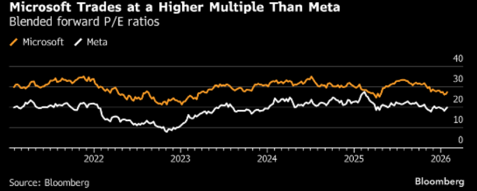 One explanation is that Microsoft struggles to provide clarity on how its AI spending feeds through into its business, and a lot of its future revenue seems to be dependent on a single customer, OpenAI, which is also a related party. Revenue in the Azure cloud business grows more slowly than AI spending, but the company is also selling AI compute across other areas of its business and not breaking it out in its reporting. Meta is also cheaper than Microsoft.
