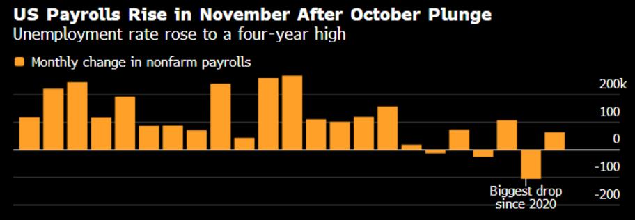 a. Payrolls rose 64,000 in November. While above the median forecast of economists, that came after an outsize 105,000 decline in October that was driven by a 157,000 plunge in government payrolls: the deferred impact of DOGE cuts to the federal workforce.