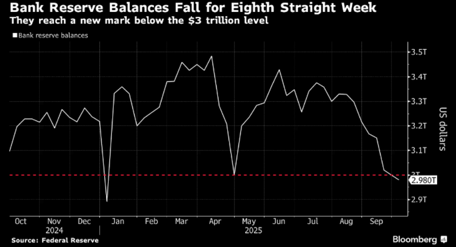 Fed officials till recently appear divided over how low they could take bank reserves while avoiding market volatility. Fed Vice Chair for Supervision Michelle Bowman said at the end of September the Fed should seek to achieve the smallest balance sheet possible, with reserve balances at a level closer to scarce than ample. Governor Christopher Waller has said an optimal level of reserves would be around $2.7 trillion.