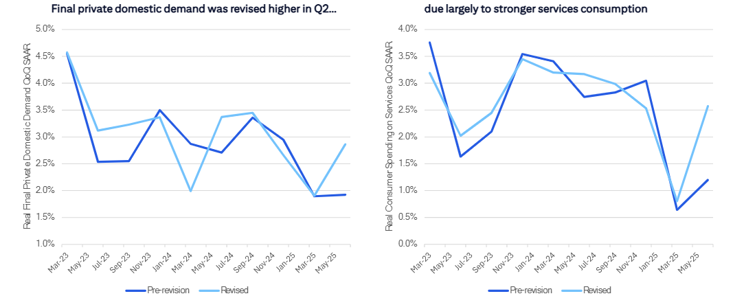 Large upward revisions to consumer spending (and by extension final private domestic demand) in Q2 make the slowdown in Q1 look less persistent. The underlying pace of growth as measured by final private domestic demand had slowed in unrevised data from around 3% last year to sub-2% this year. But the substantial upward revision to consumer services spending in Q2 now makes Q1 look more like an outlier amongst a still strong trend.