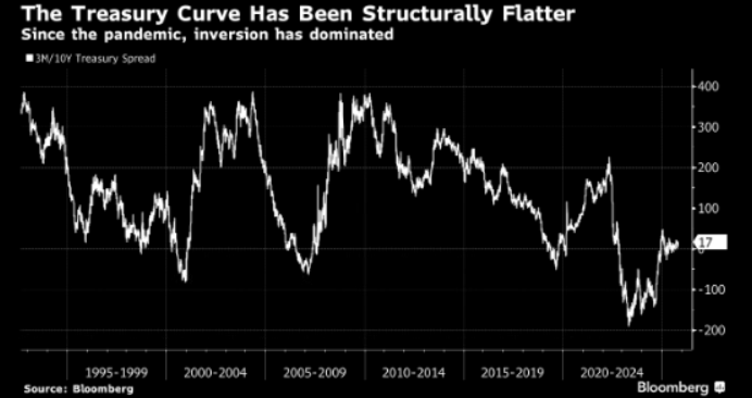 But if the outlook is all rainbows and so flowery, why is the 10-year Treasury yielding less than fed funds? One interpretation is that since the Federal Reserve’s last rate hike cycle, the central bank has countered with a structurally dovish policy path, cutting 125 basis points, soon to be 150, with CPI still at 3%, 1% above target. That has meant a flatter yield curve from 3 months to 30 years recently than at any time outside of recession before 2020.