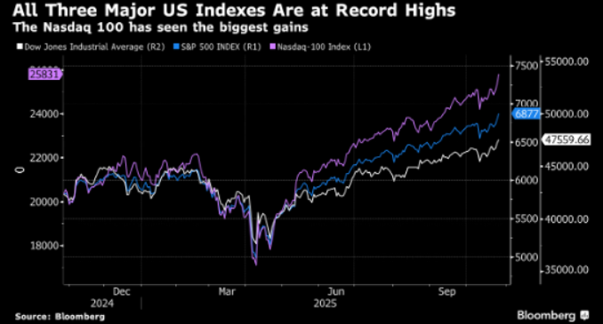 Positive US-China trade and AI news sent the S&P 500, Nasdaq 100 and Dow Jones Industrial Average to fresh, all-time highs. However, a report that Amazon was set to cut 30,000 corporate jobs fueled a Treasury rally that highlights how the bond-market is increasingly priced for a US slowdown.