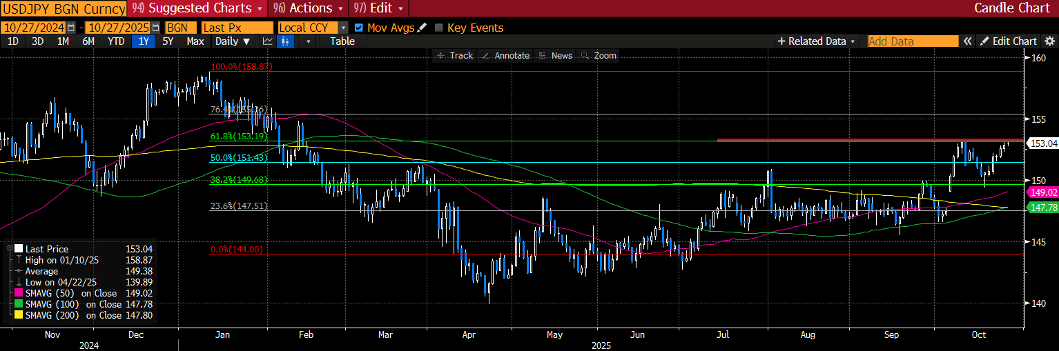 Should USD/JPY climb above the October peak (153.2) FX traders will be expecting a swarm of verbal intervention from Japanese officials. But that may be ineffective until Takaichi herself voices concern that the yen has fallen too far. The next level after 153.2 is straightaway 155.35 where we expect JPY to land now before BOJ policy on 30th Oct. This is what happens when politics interferes with macros.