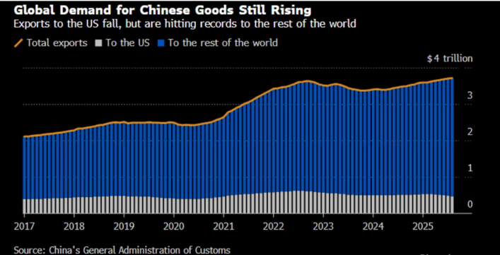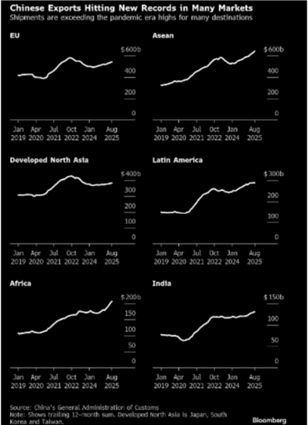 Trump’s tariff policies have unleashed Chinese export shock to the rest of the world. And proving it’s mettle, President Xi Jinping’s export engine has proved unstoppable during five months of sky-high US tariffs, sending China toward a record $1.2 trillion trade surplus. Chinese exporters are replacing US markets by ASEAN, Africa and EU markets.