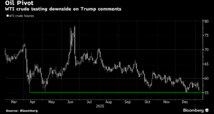 WTI crude futures are sliding after President Trump announced that Venezuela will be sending oil to the US. That’s driving the contract toward the $55 line which has been a make-or-break zone in the past year.