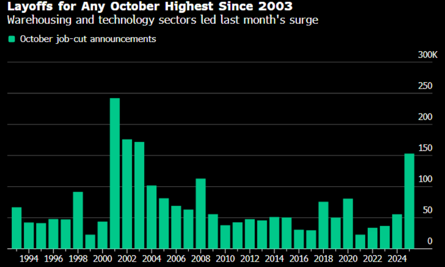 In the 2nd data, Challenger, Gray & Christmas Inc showed that US companies announced the most job cuts for any October in more than two decades as artificial intelligence reshapes industries and cost-cutting accelerates. Companies announced 153,074 job cuts last month, almost triple the number during the same month last year and driven by the technology and warehousing sectors. It’s the most for any October since 2003.