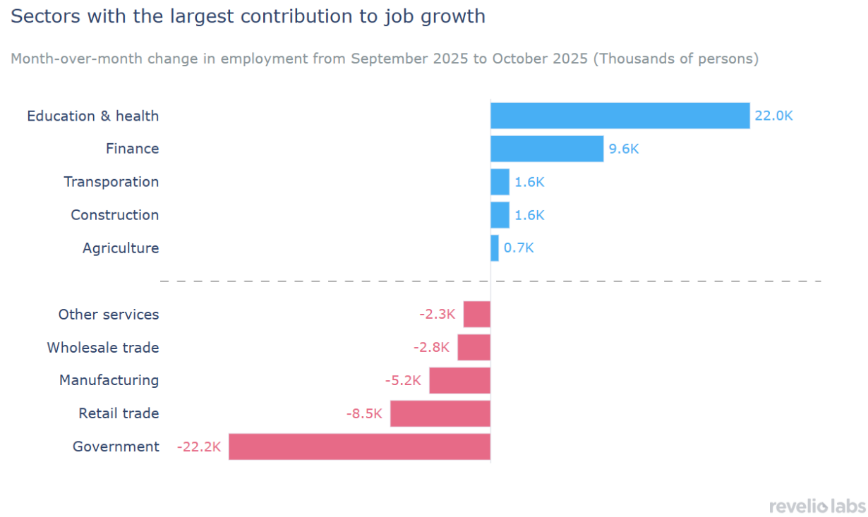 The decline in employment is driven primarily by a large decline in employment in the Government sector, which lost 22,200 jobs in October; and the Retail sector, which lost 8,500 jobs. On the other hand, the Education and health services sector continued to show relative strength, adding 22,000 jobs in October.