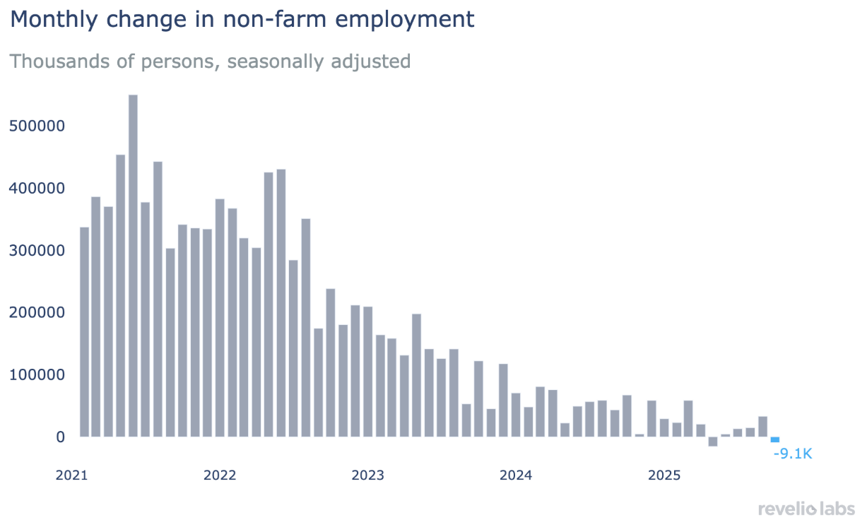 In the first data, Revelio Labs Oct employment data showed that economy lost 9,100 jobs in October. This was after showing economy added 33,000 jobs in Sep the month prior.