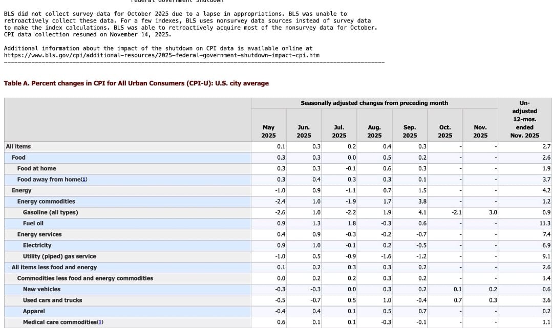 Today’s Nov US CPI data should be ignored for all practical purposes. The Bureau of Labor Statistics couldn't collect prices throughout October (as seen below) due to the government shutdown, which may have skewed the data and resulted in sizable downward pressure on the November inflation figures.